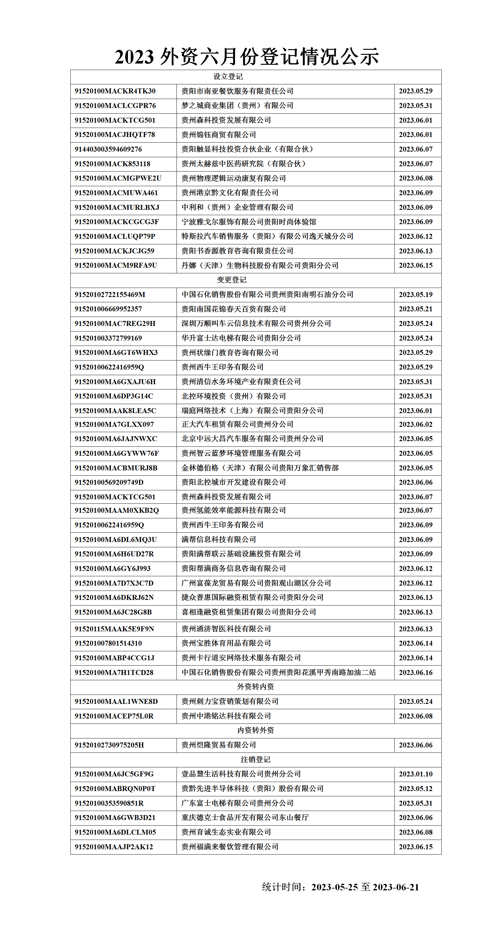 贵阳市2023年度外资六月份登记情况公示,具体情况如下: