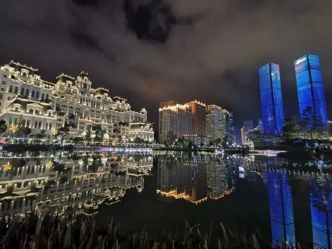 「花果园铂翎汇艺术中心」是贵阳最先出圈的网红打卡地,坐落于南明区花果园湿地公园,每当夜幕降临时,金碧辉煌的建筑倒映在水中,点缀着城市的夜色,尽显大气。