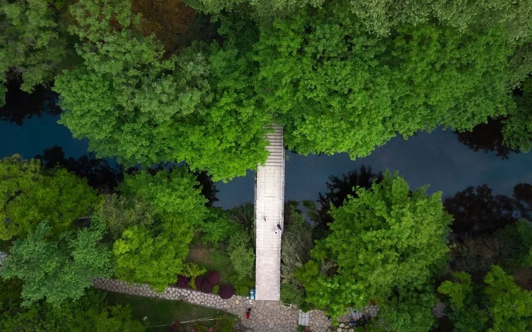这里四季皆景,从空中俯瞰,公园内的草木与山水相间,大自然的笔墨在此处挥洒,描绘出一幅幅诗意的生态画卷。