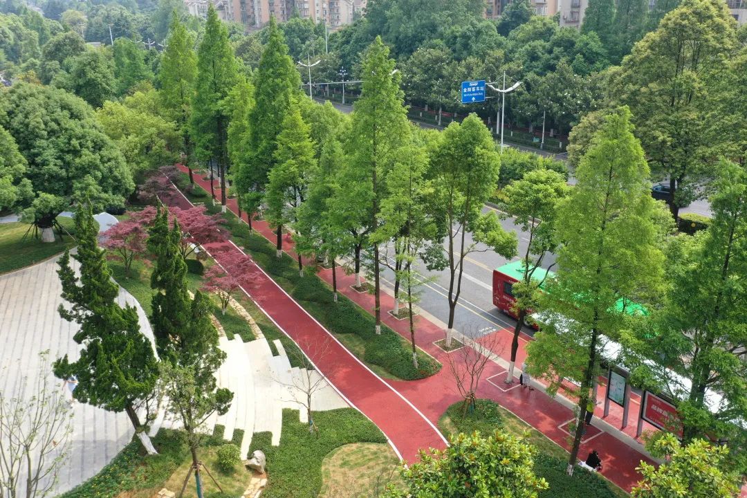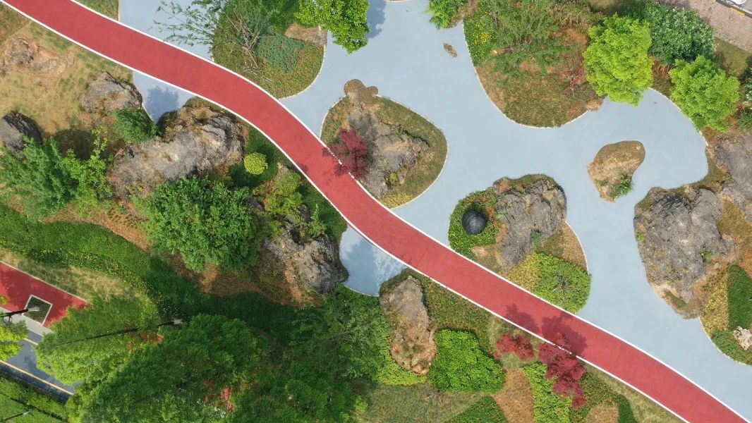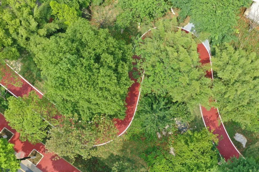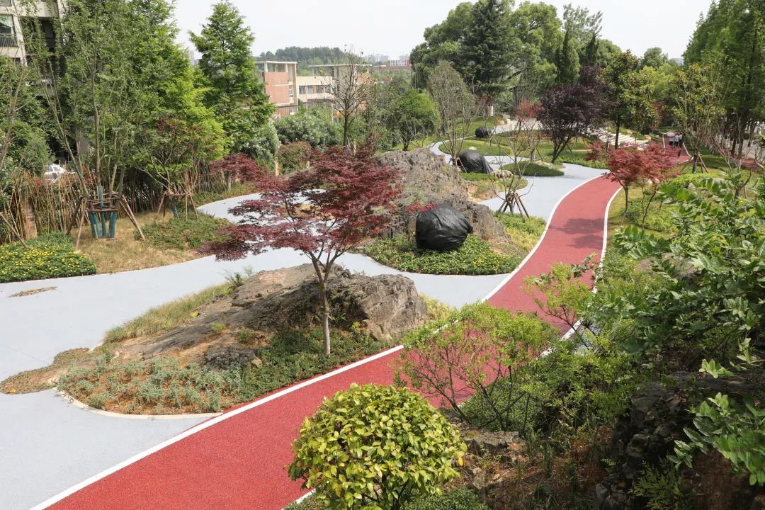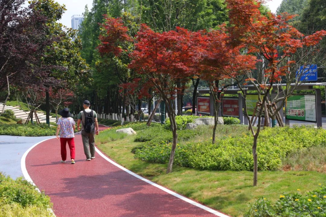 漫步园内,西边高矮各异的自然石头景观让人眼前一亮,奇石与人工移栽的植物搭配相得益彰;在园中间,两棵香樟树立于广场之中,为市民遮荫纳凉;在园东边,雨水花园利用绿化低洼地势,结合海绵城市的雨洪管理概念进行建设 。风格各异的美景中,一条健康绿道串联起3个公园,成为绿色生态景观廊道。跑友们在此拉伸、跑步,解锁新的健康生活。