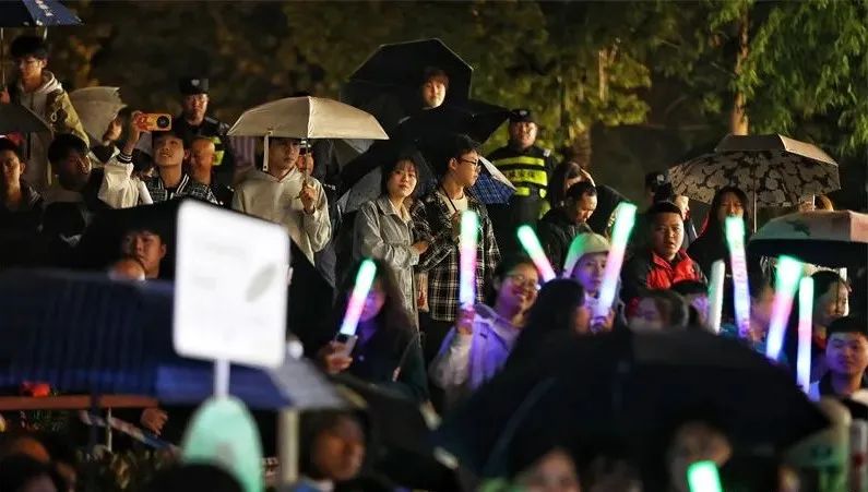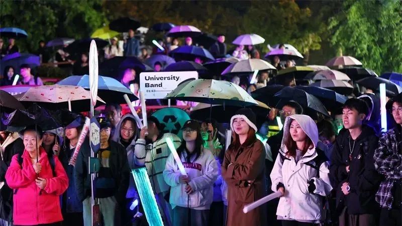 现场乐声不停,四支来自不同学校的大学生乐队,分别给观众带来《山海》《爱很简单》《今日青年》《你要跳舞吗》等深受年轻群体喜爱的歌曲。现场观众挥舞的荧光棒和手机灯光、热烈的大合唱,让音乐会澎湃着强烈的青春能量。
