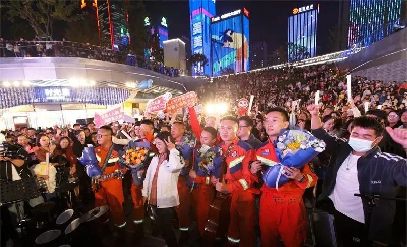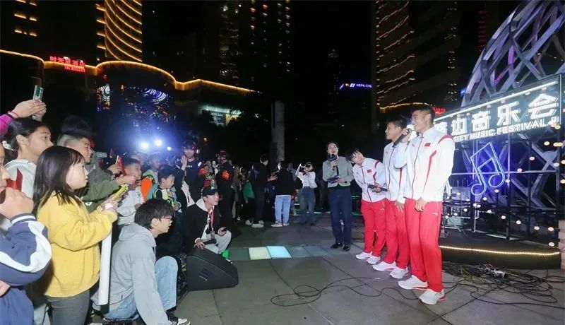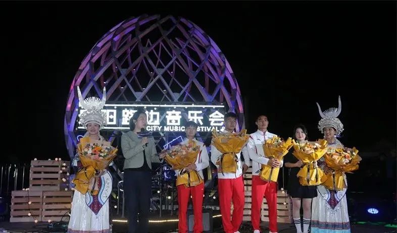 在音乐会的压轴环节,刚刚在亚运会上勇夺冠军、载誉归来的贵州健儿帅常文、冯朝朝、杨海雷登台,与全场观众一起合唱《追梦赤子心》,共勉永不言败的体育精神。