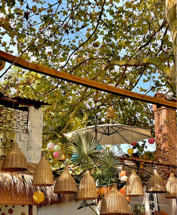 丘山梧桐店如其名,建于山间,梧桐为伴,树间装点着灯光,木桌、高椅、花园小道,山间小院的风格,却有着电影的精致与浪漫,烤肉、精酿、咖啡……丰俭由人。