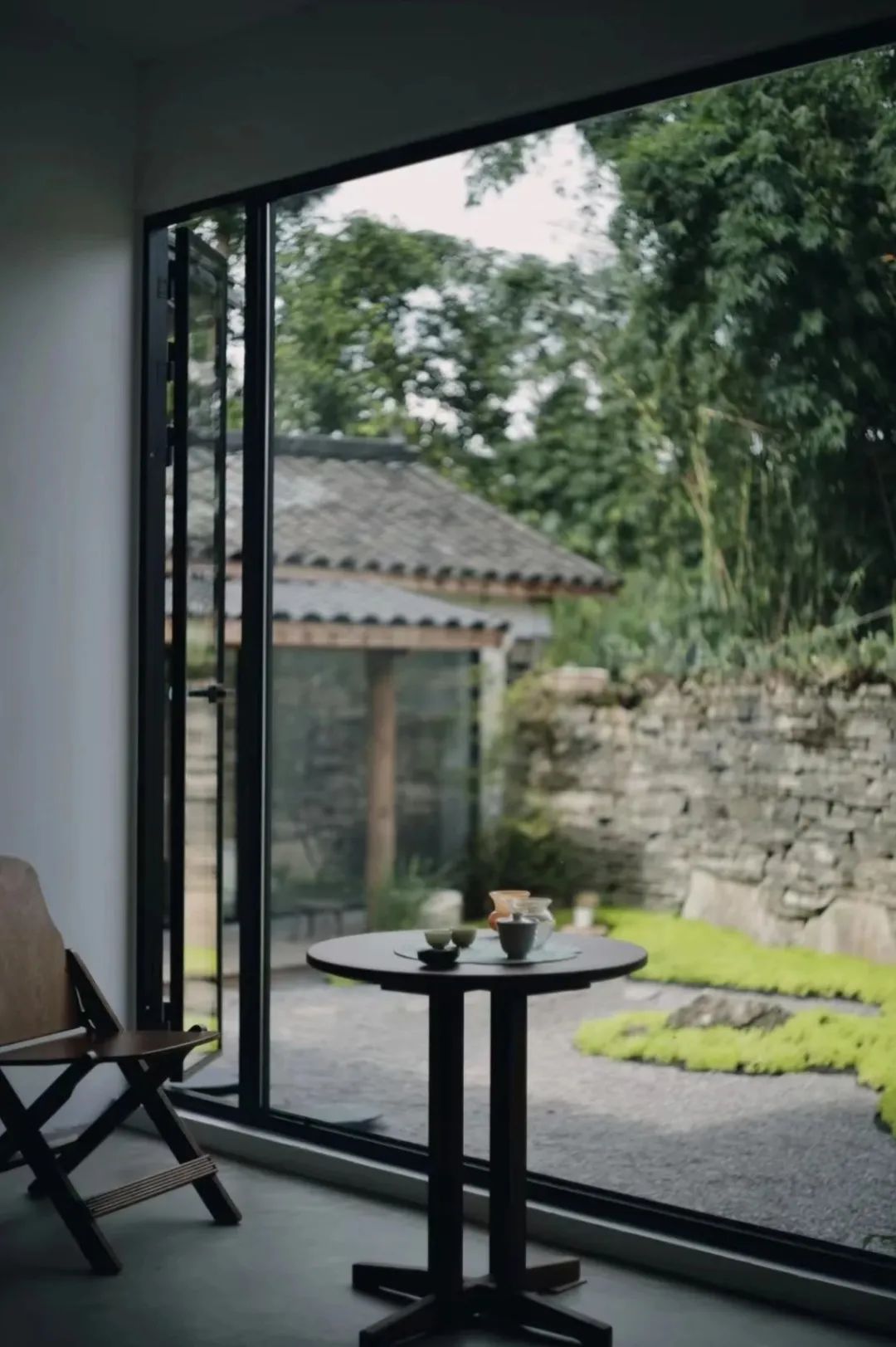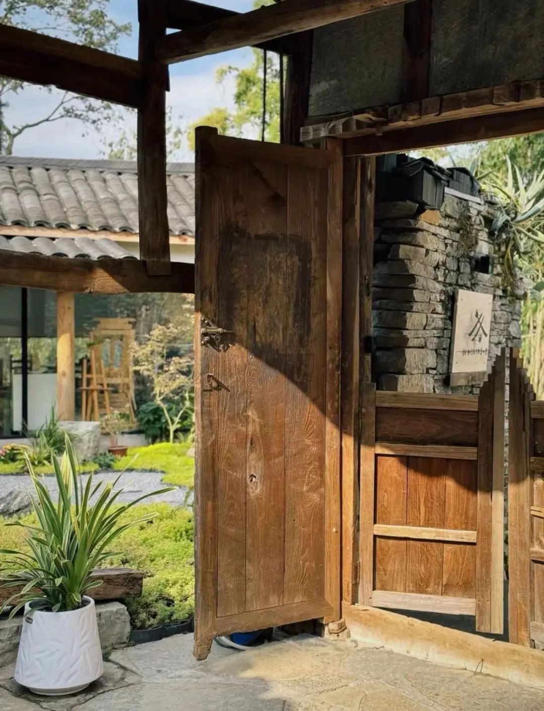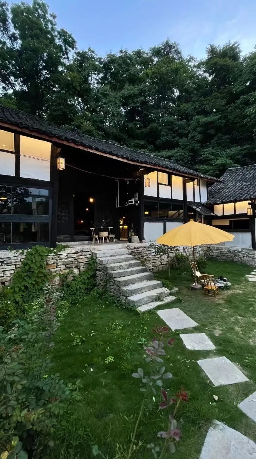 小院坐落在山林间,由砖瓦石块搭建而成。刚入门,就被满满中式风吸引。没有繁华的装饰,留白的空间让门外的绿意更加夺目。