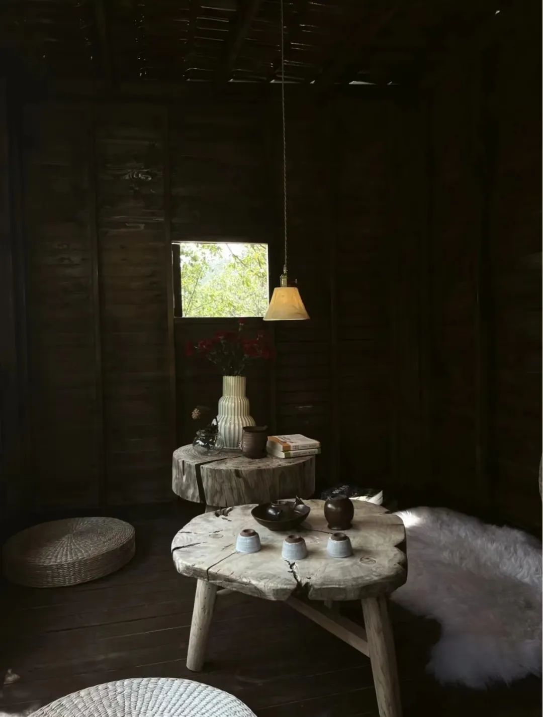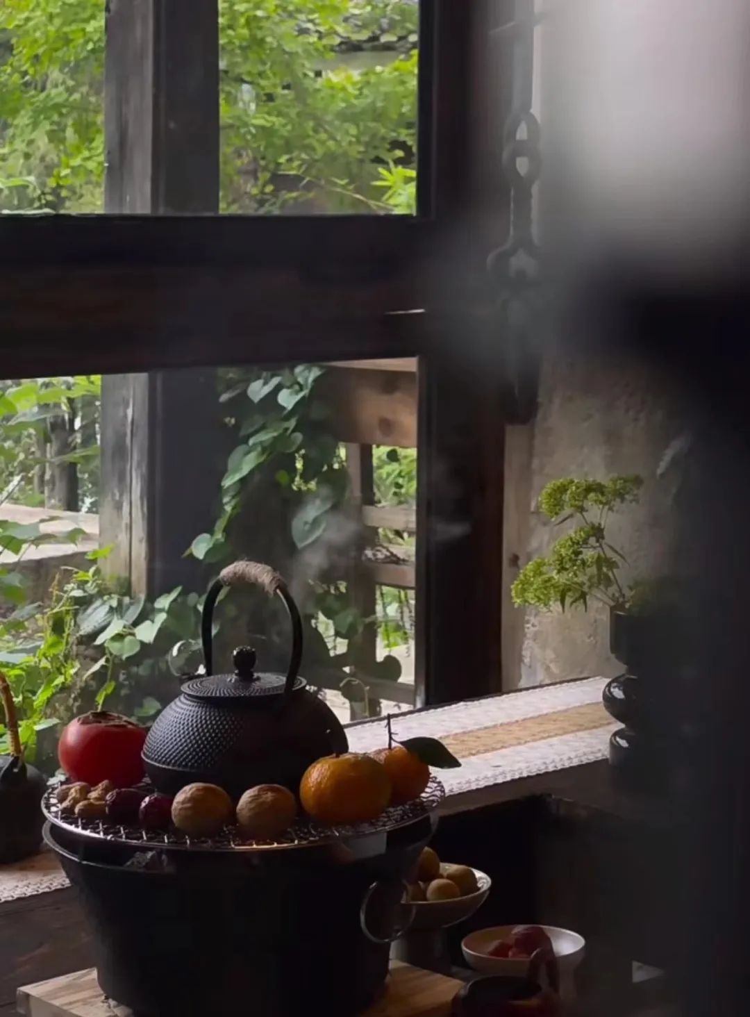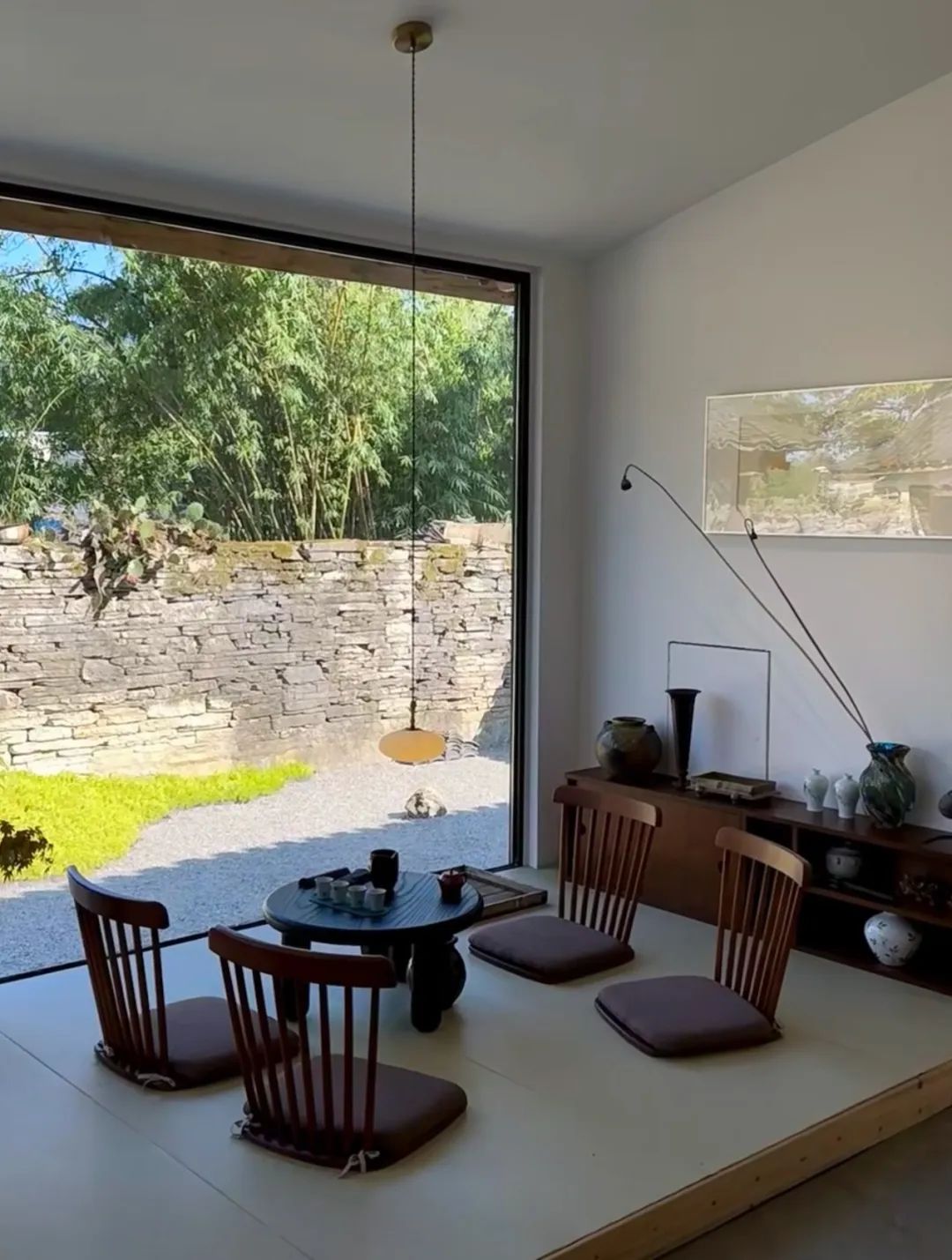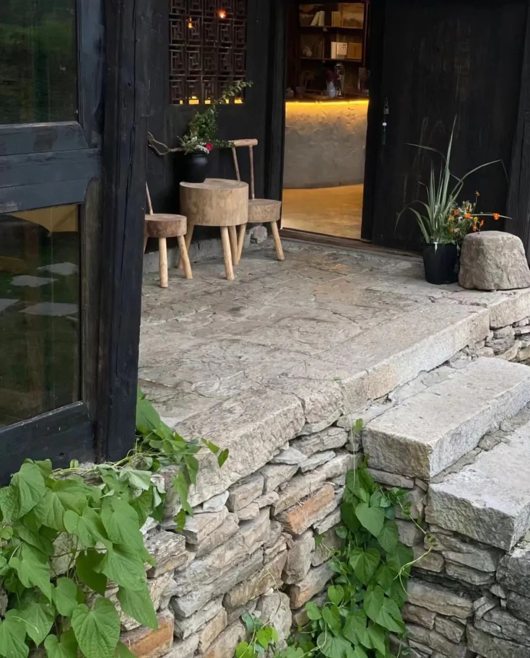 小院坐落在山林间,由砖瓦石块搭建而成。刚入门,就被满满中式风吸引。没有繁华的装饰,留白的空间让门外的绿意更加夺目。