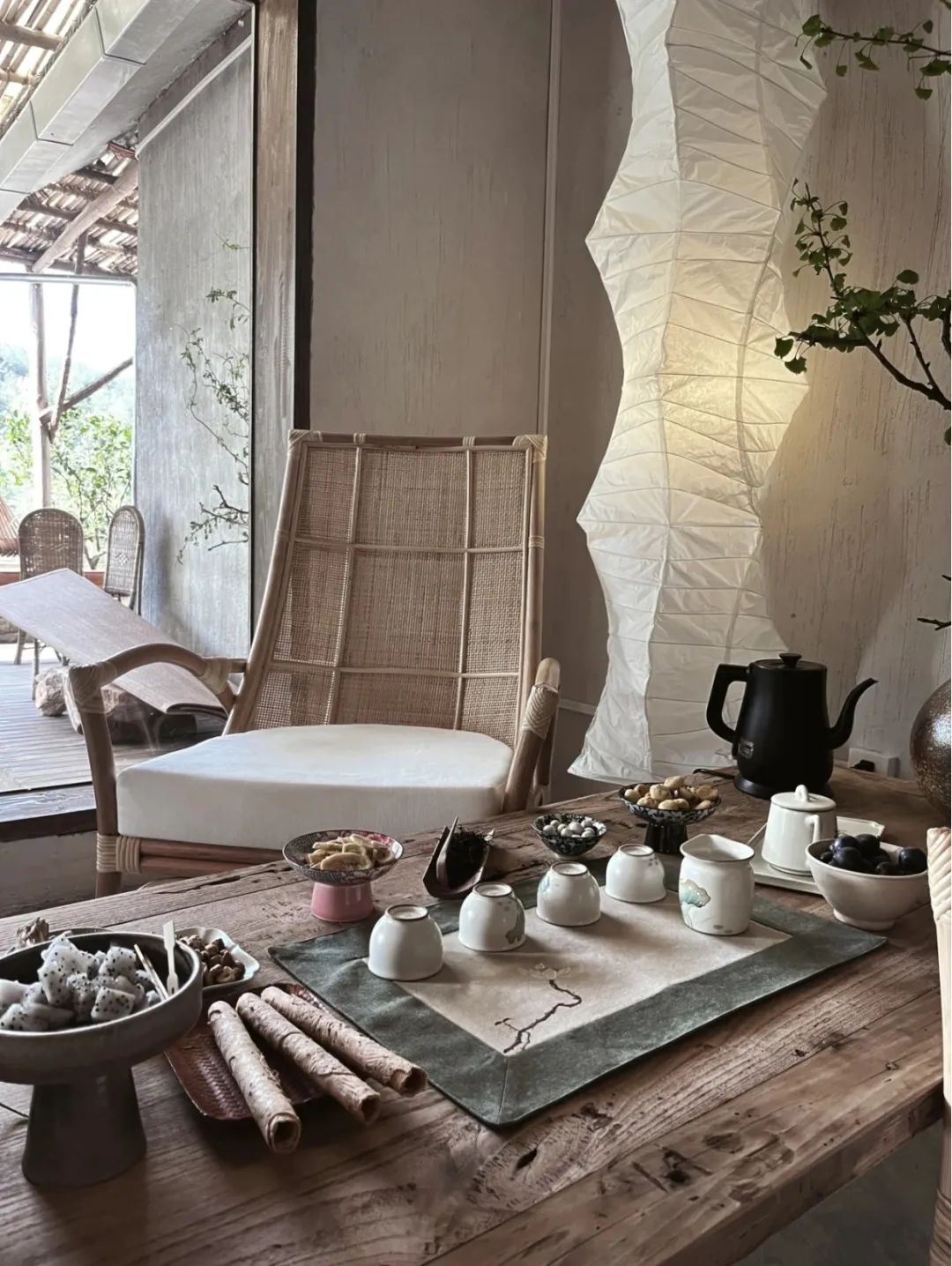 这里喝茶多在室外,矮树下放置一张小木桌,席地而坐,就能开启悠闲的喝茶模式,慵懒,惬意。