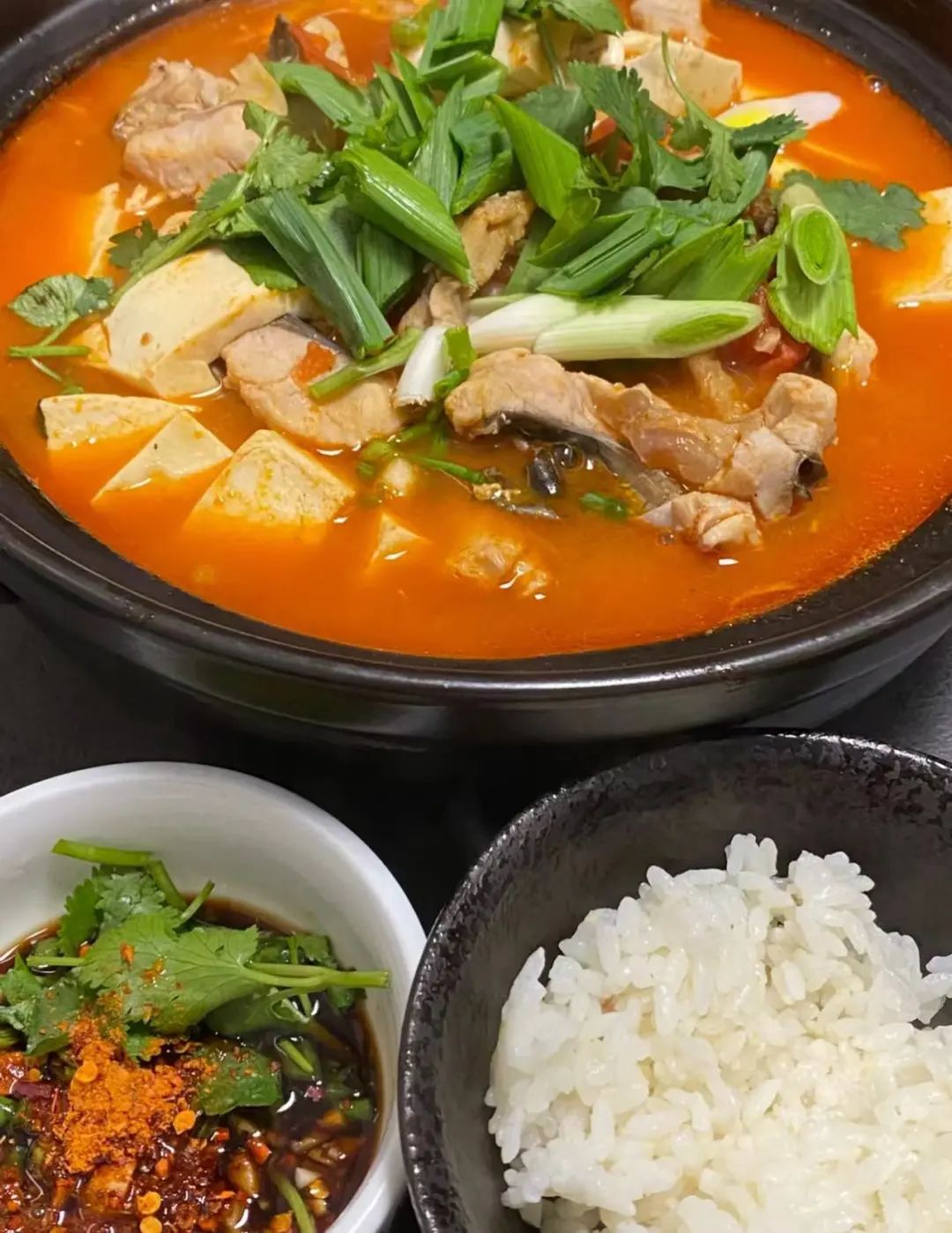 只需将汤底烧热,放入喜欢的配菜,例如土豆、鸡血、肥肠等。锅里的糍粑辣椒只会越煮越香,软糯的鸡肉配上一口热腾腾的米饭,就算是不爱吃饭的人也会忍不住“怒炫”三碗!