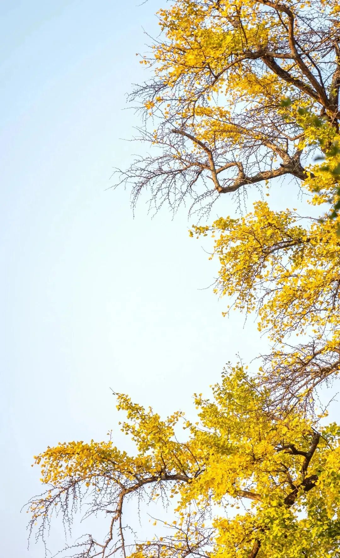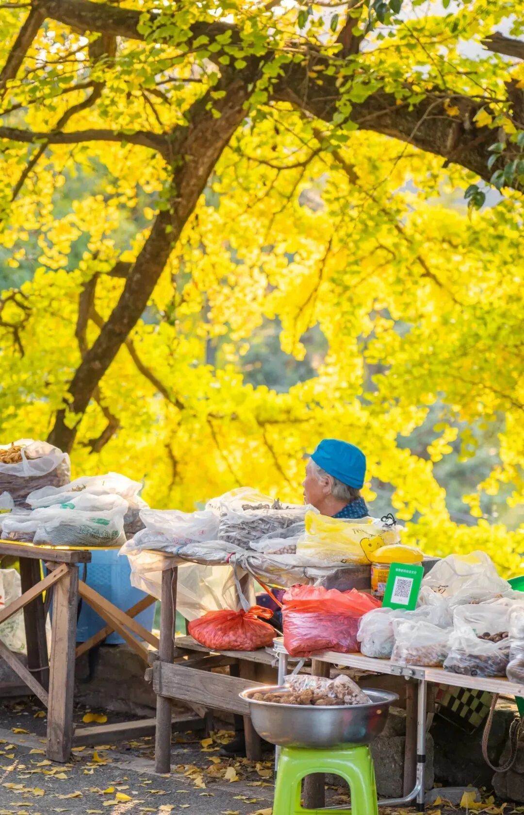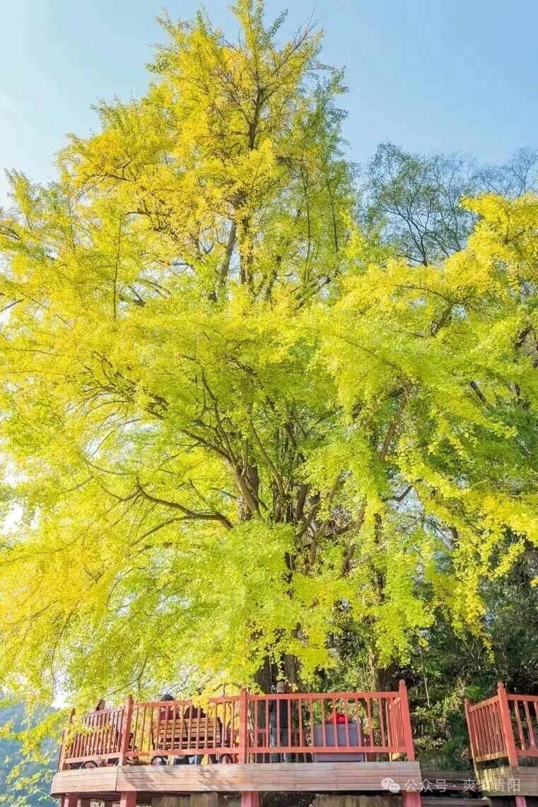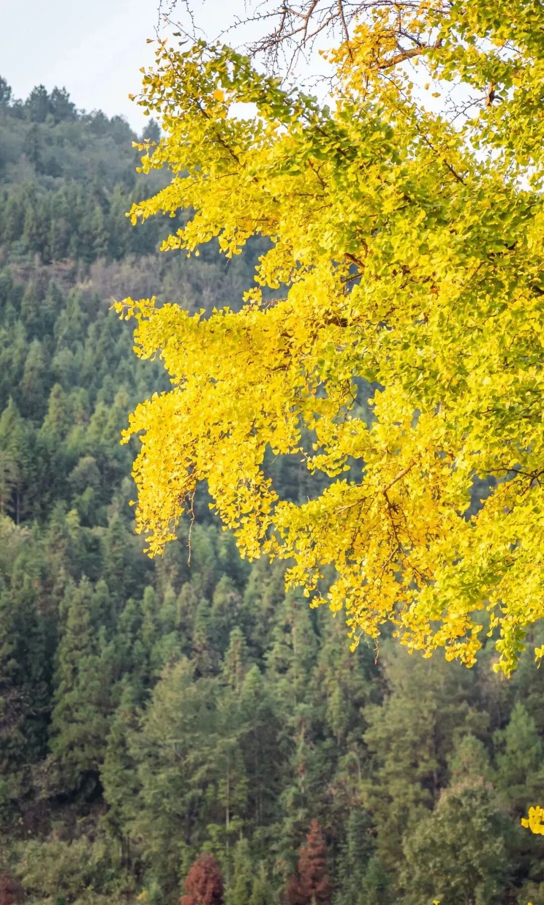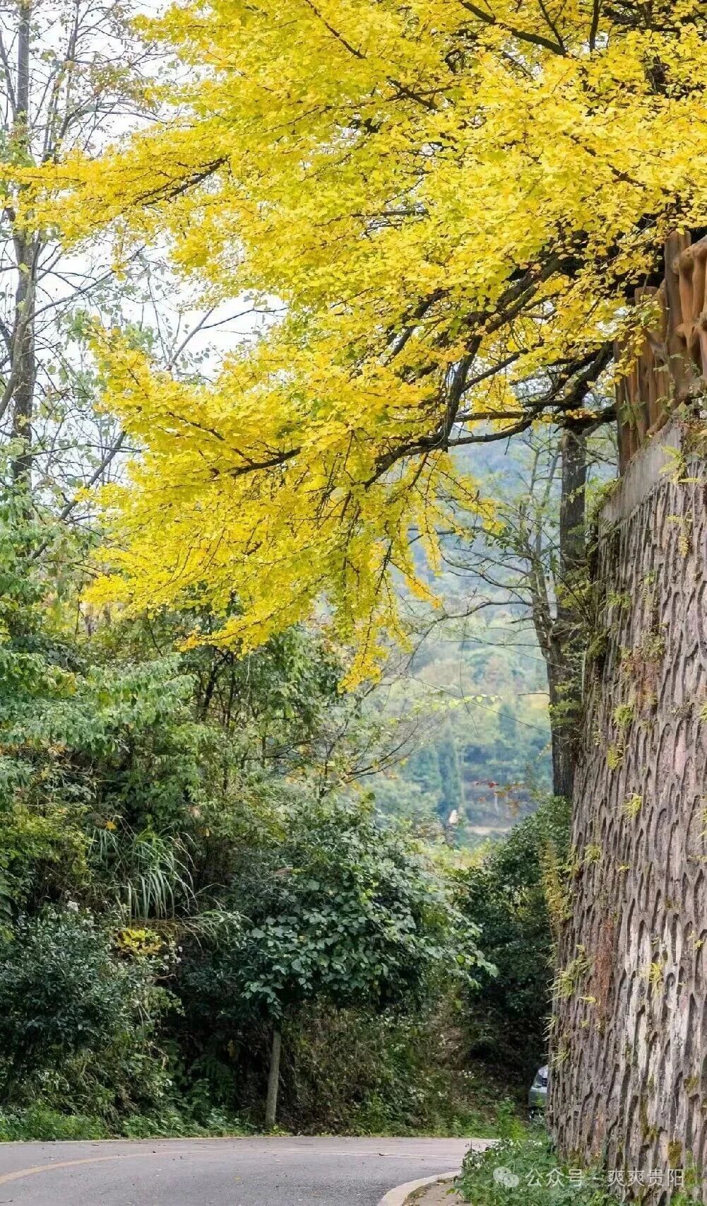 这里的银杏树在秋风吹拂下逐渐变黄,蔚蓝的天空、渐变色的山林映衬着金黄的银杏,秋风吹起时,“金蝴蝶” 飞落的景象十分美丽。