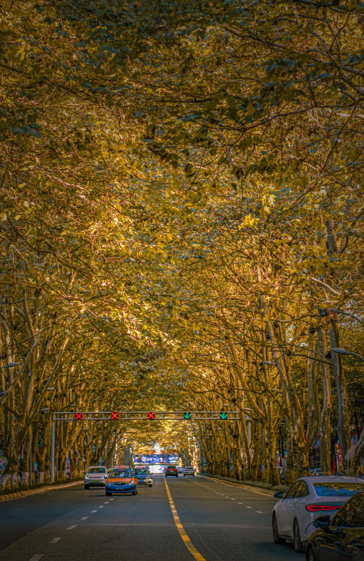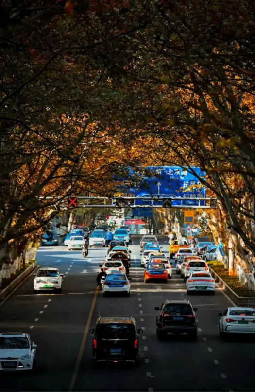 道路两旁栽种了大量的法国梧桐,秋天时梧桐树叶变得金黄,微风吹过,树叶或夹在车窗上疾驰而过,或散落在路上,装点着贵阳老城的秋季。