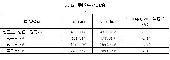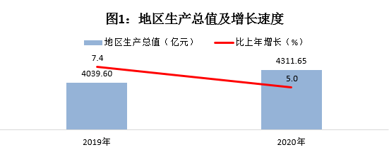 初步核算,2020年全市实现地区生产总值(2)4311.65亿元,同比增长5.0%。其中,第一产业增加值178.31亿元,增长6.4%;第二产业增加值1552.59亿元,增长5.5%;第三产业增加值2580.75亿元,增长4.4%。