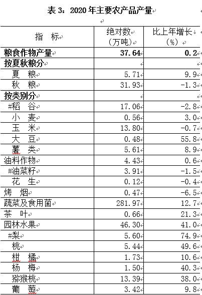 全年粮食产量37.64万吨,比上年增长0.2%。其中,夏粮产量5.71万吨,增长9.9%;秋粮产量31.93万吨,下降1.3%。