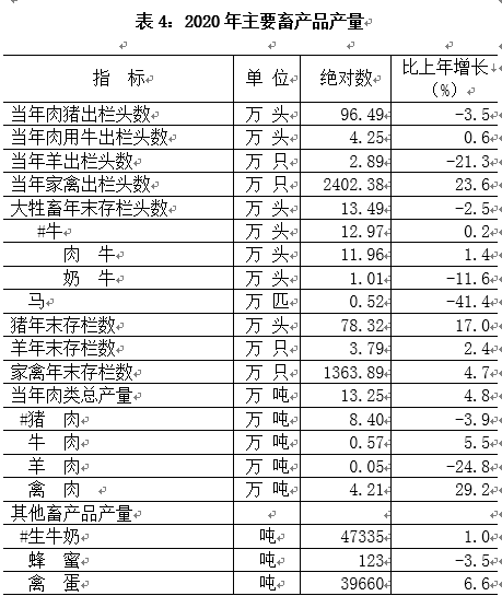 全年肉类总产量13.25万吨,比上年增长4.8%;禽蛋产量3.97万吨, 比上年增长6.6%;奶类产量4.73万吨,比上年增长1.0%;水产品产量0.36万吨,比上年增长8.2%。