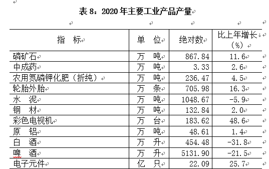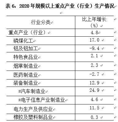 全年规模以上工业(3)增加值比上年增长6.1%。重点产业(行业)规模以上工业增加值比上年增长4.8%,占规模以上工业增加值的83.9%;其中,磷煤化工业增加值增长17.0%、装备制造业增加值增长12.9%、电力生产及供应业增加值增长11.5%、烟草制品业增加值增长2.3%、特色食品业增长2.1%。工业园区规模以上工业企业增加值比上年增长5.3%,占规模以上工业增加值的78.9%。