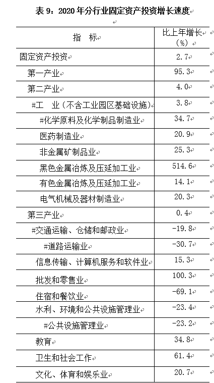 全年固定资产投资(4)比上年增长2.7%。分产业看,第一产业投资增长95.3%;第二产业投资增长4.0%;第三产业投资增长0.4%。
