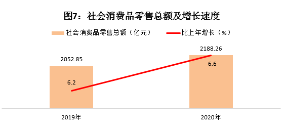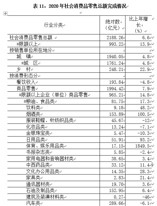 全年实现社会消费品零售总额2188.26亿元,比上年增长6.6%。按经营地统计,城镇消费品零售额1940.05亿元,增长4.8%,其中城区消费品零售额1761.24亿元,增长4.8%;乡村消费品零售额248.21亿元,增长22.9%。按消费形态分,商品零售1994.42亿元,增长7.9%;餐饮收入193.84亿元,下降4.8%。