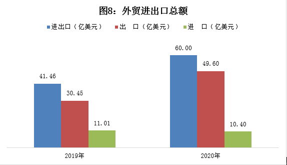 全年外贸进出口总额60.00亿美元,比上年增长(5)44.7%。其中出口49.60亿美元,增长62.9%;进口10.40亿美元,下降5.5%。