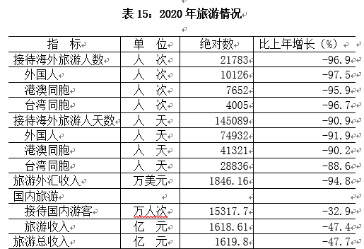 全市全年旅游总人数15319.88万人次,比上年下降33.1%,其中接待国内游客15317.7万人次,接待外国(海外)游客2.18万人次。旅游总收入1619.8亿元,比上年下降47.7%,其中旅游外汇收入达1846.16万美元,下降94.8%。