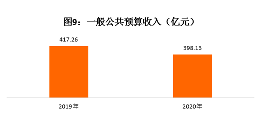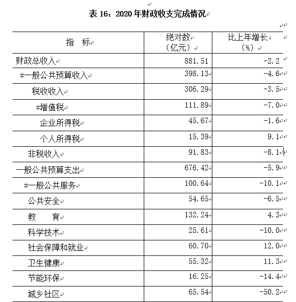 全年完成财政总收入881.51亿元,比上年下降2.2%;一般公共预算收入398.13亿元,比上年下降4.6%;一般公共预算支出676.42亿元,比上年下降5.9%。