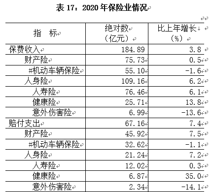 全年保险保费收入184.89亿元,比上年增长3.8%。保险赔付支出67.16亿元,比上年增长7.4%。