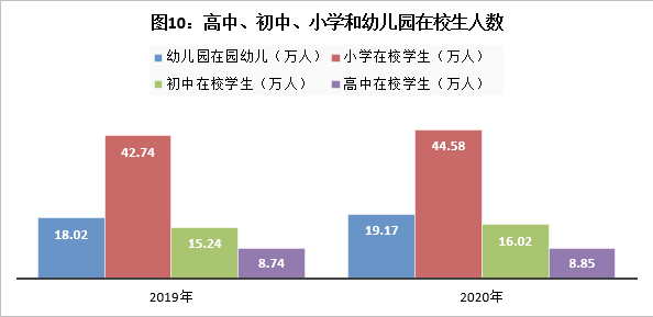 2020年,全市研究生教育招生9913人,在校生25091人,毕业生6290人;普通高等教育招生13.59万人,在校生44.02万人,毕业生10.28万人;成人高等教育招生2.15万人,在校生6.44万人,毕业生1.85万人;中等职业教育招生3.56万人,在校生10.50万人,毕业生3.21万人;普通高中招生3.04万人,在校生8.85万人,毕业生2.86万人;普通初中招生5.74万人,在校生16.02万人,毕业生4.87万人;普通小学招生8.01万人,在校生44.58万人,毕业生5.87万人;特殊教育招生238人,在校生1356人,毕业生278人;幼儿园入园8.13万人,在园19.17万人,离园6.59万人。