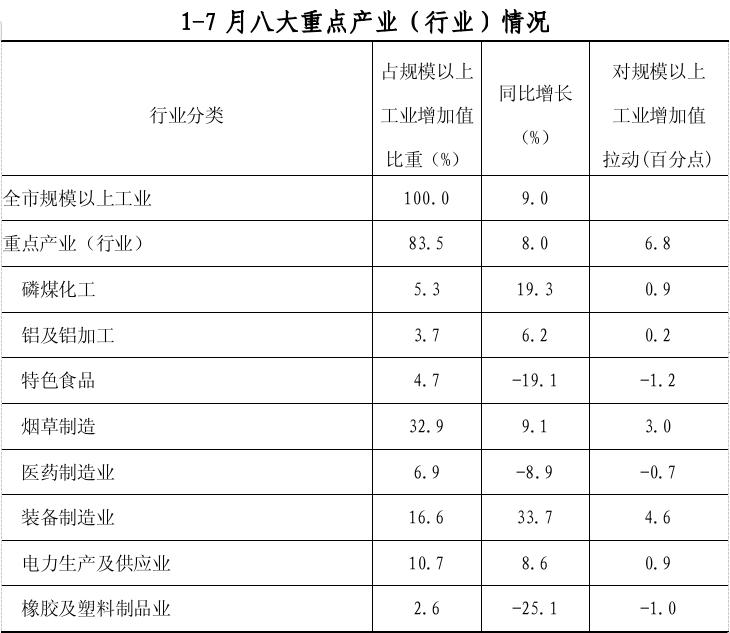装备制造业拉动显著。1-7月,全市规模以上磷煤化工、烟草制造、装备制造业、电力生产及供应四大重点行业增加值占比65.5%,增速均高于全市平均水平,共拉动规模以上工业增加值增长9.4个百分点。其中,装备制造业同比增长33.7%,拉动规模以上工业增加值增长4.6个百分点。