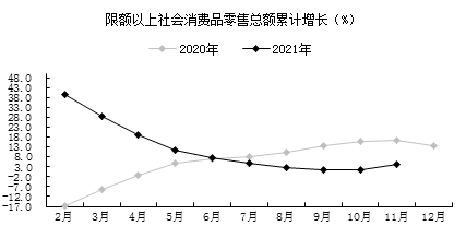 1-11月,限额以上社会消费品零售额953.48亿元,同比增长4.4%,增速比1-10月提高2.8个百分点,两年平均增长10.3%。