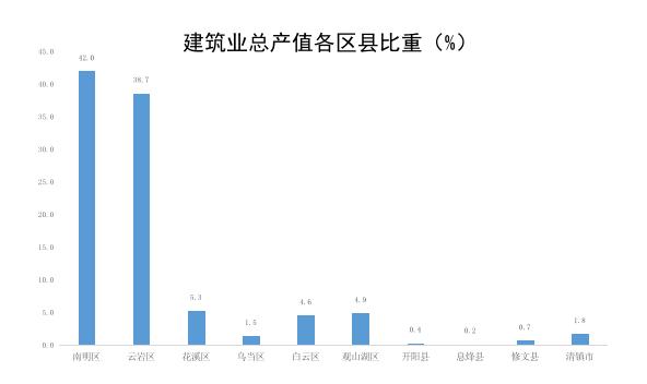 从分区县来看,全市426资质以上建筑业企业中,注册地在南明区和云岩区的有214家,占全市的50.2%。按完成总产值情况来看,南明区和云岩区资质以上建筑业企业合计完成总产值2330.12亿元,占全市的80.7%,两个区的建筑业企业经营数据的波动会对全市建筑业产生较大影响。