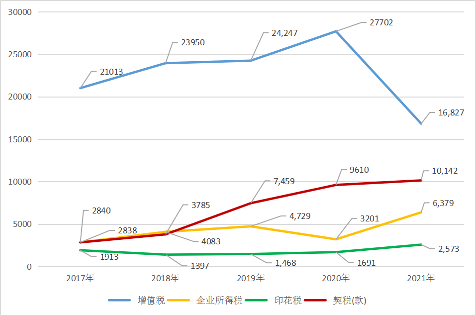 五年来,我们紧盯税源抓收入,竭力推进财政收入“提质量”。面对经济持续低迷、企业生产经营困难、国家减税降费政策调整等诸多困难,财税部门深挖主体税种增收潜力,紧盯税源狠抓收入,努力做到应收尽收,千方百计夯实收入基础、提升收入质量。2021年的一般公共预算收入91738万元较2017年的91164万元虽然是略有增长,但我们消化了前几年的一次性收入因素影响,使收入管理的常态化形成常态,收入质量明显提高。其中:增值税2017年实现21013万元,2021年16827万元,下降19.92%;企业所得税2017年2838万元,2021年6379万元,增长124.77%,年均增长22.44%;印花税2017年1913万元,2021年2573万元,增长34.50%,年均增长7.69%;契税2017年2840万元,2021年10142万元,增长257.11%,年均增长37.47%。(具体增长情况见图一)