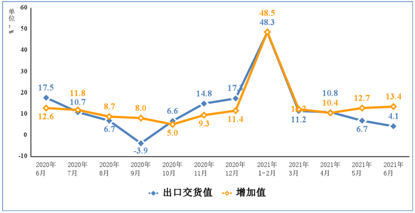 图1 2020年6月以来电子信息制造业增加值和出口交货值分月增速
