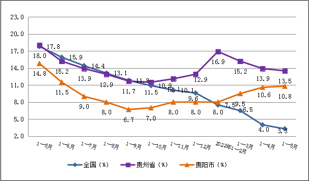 图一全国、全省、贵阳市1—5月规上工业增加值增速对比图