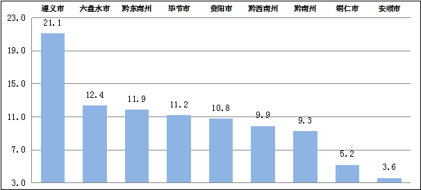 1—5月,全市规模以上工业增加值同比增长10.8%,低于全省(13.5%)2.7个百分点,高于全国(3.3%)7.5个百分点(图一),在西部10个省会城市排名第2位、较去年同期提升1个位次(图二),在全省排名第5位、较去年同期提升4个位次(图三)。