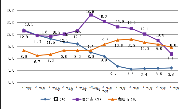 图一全国、全省、贵阳市1—8月规上工业增加值增速对比图
