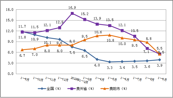 图一全国、全省、贵阳市1—9月规上工业增加值增速对比图
