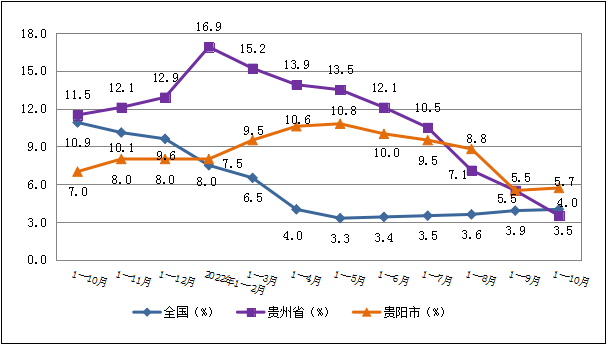 图一全国、全省、贵阳市1—10月规上工业增加值增速对比图