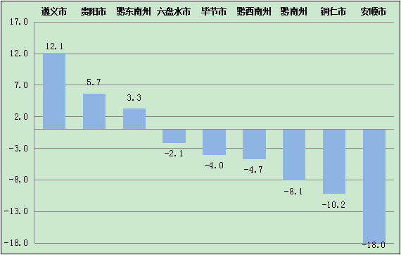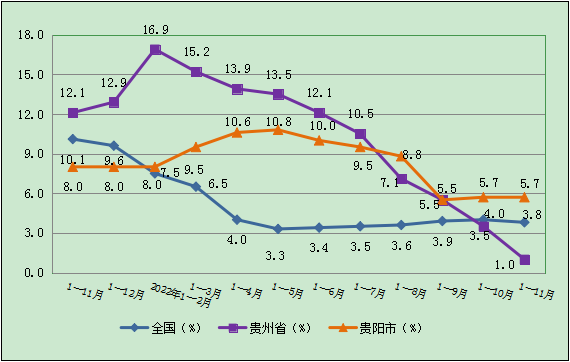 图一全国、全省、贵阳市1—11月规上工业增加值增速对比图