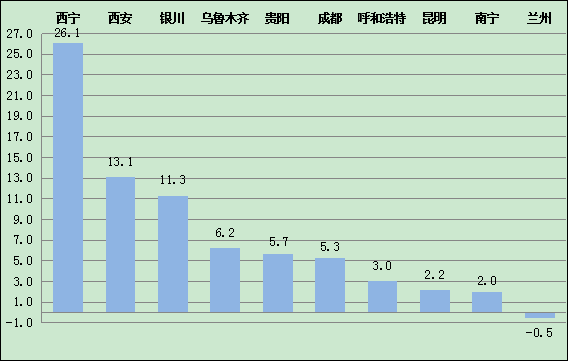 1—11月,全市规模以上工业增加值同比增长5.7%,分别高于全国(3.8%)、全省(1.0%)1.9个、4.7个百分点(图一),在西部10个省会城市排名第5位(图二),在全省排名第2位(图三)。