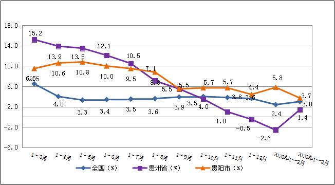 图一全国、全省、贵阳市2023年1—3月规上工业增加值增速对比图