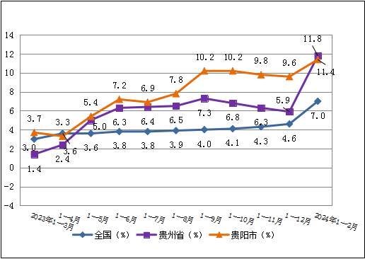 图一 2024年1—2月全国、全省、贵阳市规上工业增加值增速对比图