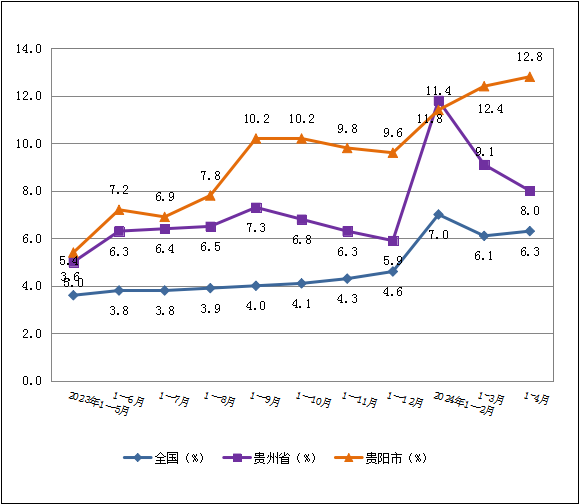 图一 2024年1—4月全国、全省、贵阳市规上工业增加值增速对比图