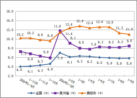 2024年1—9月全国、全省、贵阳市规上工业增加值增速对比图