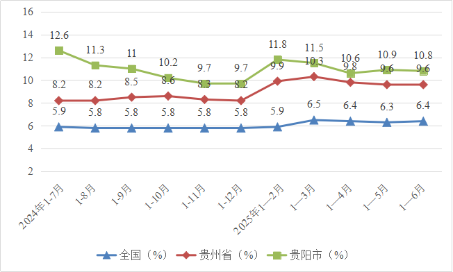 2025年1—6月全国、全省、贵阳市规上工业增加值增速对比图