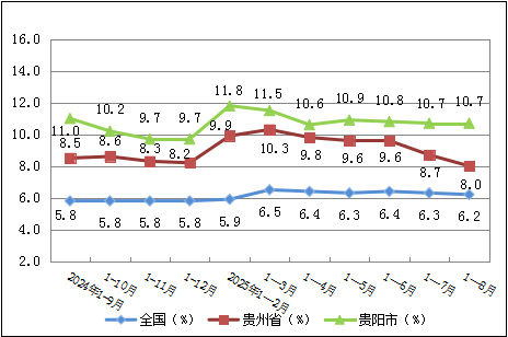2025年1—8月全国、全省、贵阳市规上工业增加值增速对比图
