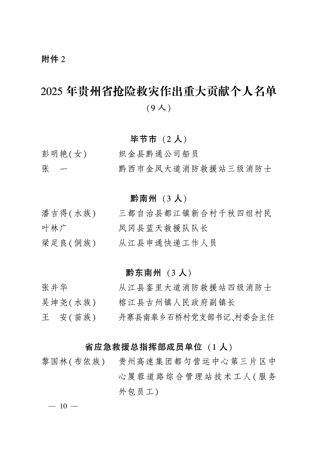 为深入贯彻习近平总书记关于防汛抢险救灾工作的重要指示精神,表扬先进、树立典型、鼓舞士气,进一步激励广大党员干部群众在灾害面前积极担当作为,敢于拼搏奉献,引导全社会关心、支持、参与抢险救灾工作,省委、省政府决定对榕江县古州镇党委等106个抢险救灾表现突出集体,潘吉得、彭明艳、张一、叶林广、梁足良、张井华、吴坤尧、王安、黎国林9名抢险救灾作出重大贡献个人,杨永炼等600名抢险救灾表现突出个人予以通报表扬。希望受到表扬的集体和个人珍惜荣誉、再接再厉,立足岗位为推动全省高质量发展、维护人民生命财产安全和社会稳定作出新的贡献。