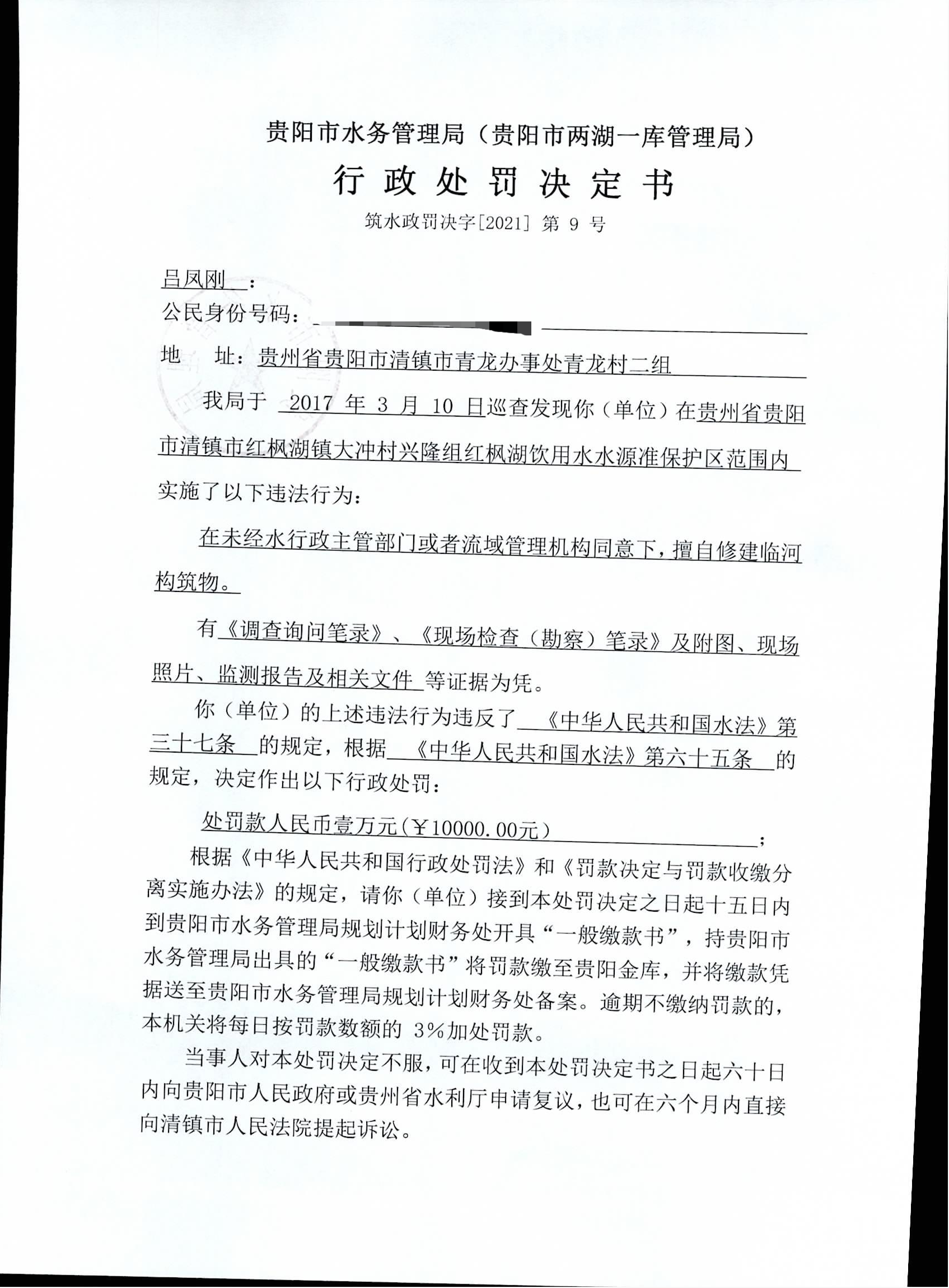 吕凤刚在百花湖最高水位线以下河道管理范围内修建临河构筑物处罚决定书,详情如下:
