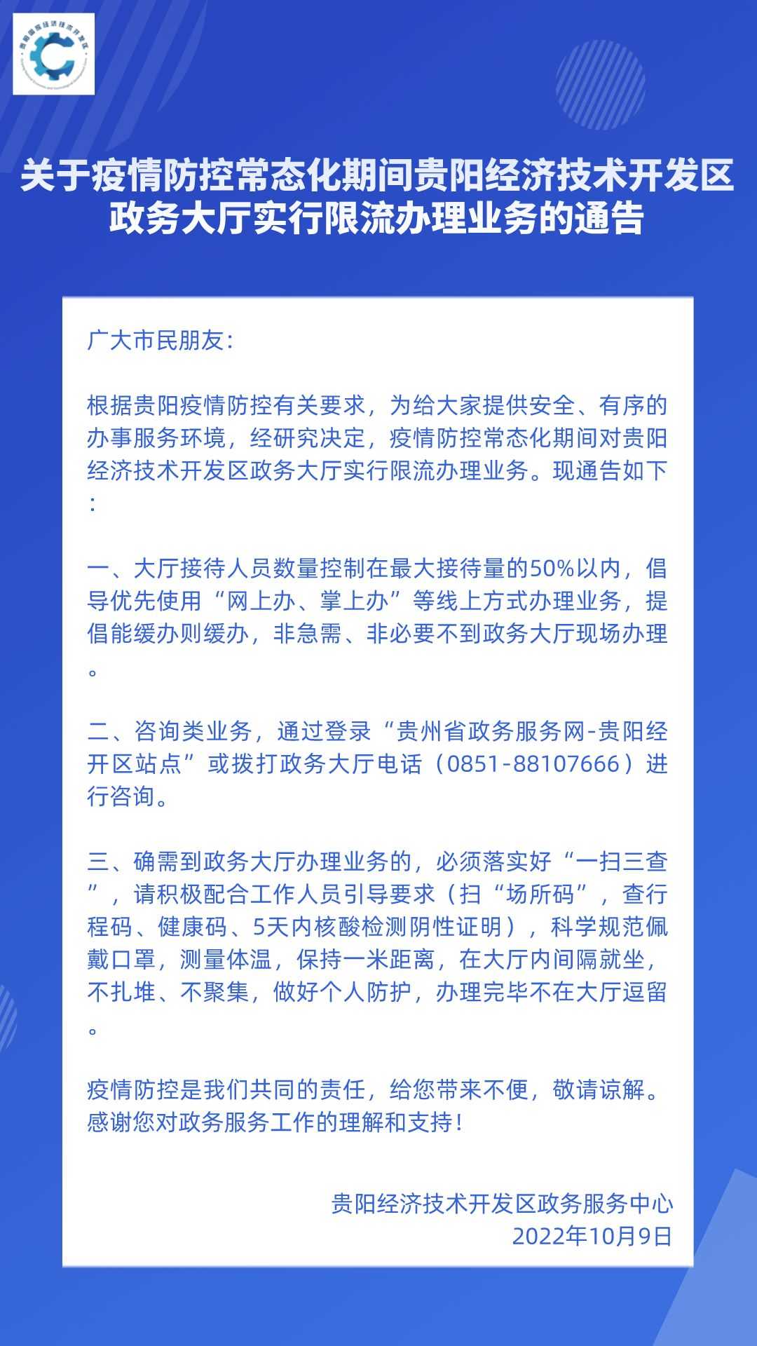 关于疫情防控常态化期间贵阳经济技术开发区政务大厅实行限流办理业务的通告,内容如下: