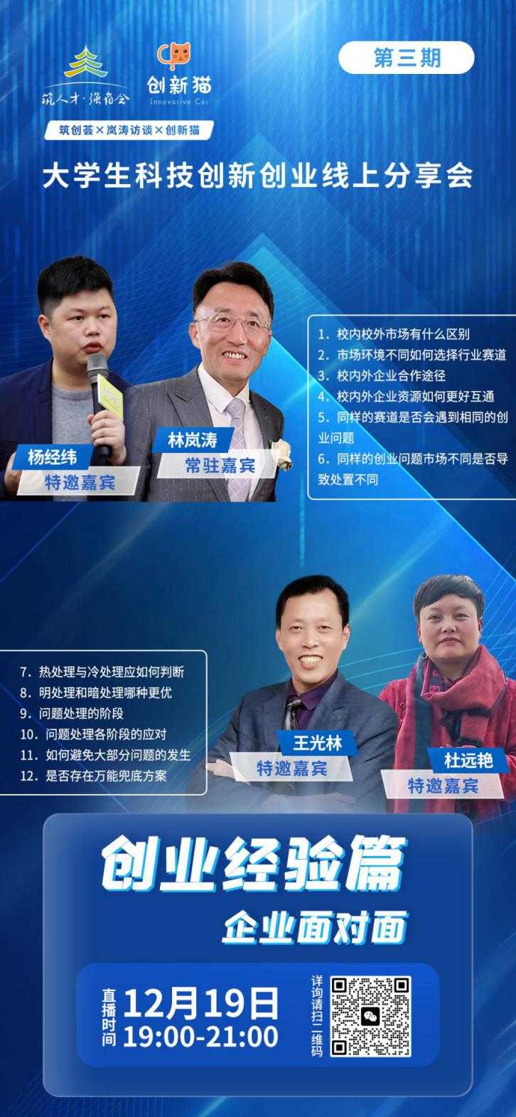 其中线上分享会旨在通过高校学者、企业家的经验分享,及嘉宾与创业者的互动交流,对大学生年轻创客群体进行创业指导,着力解决大学生创新创业中在技术、资本、人才、服务等方面存在的问题,帮助大学生更有效地开展自主创业,将于12月19日开展第三期线上分享活动。