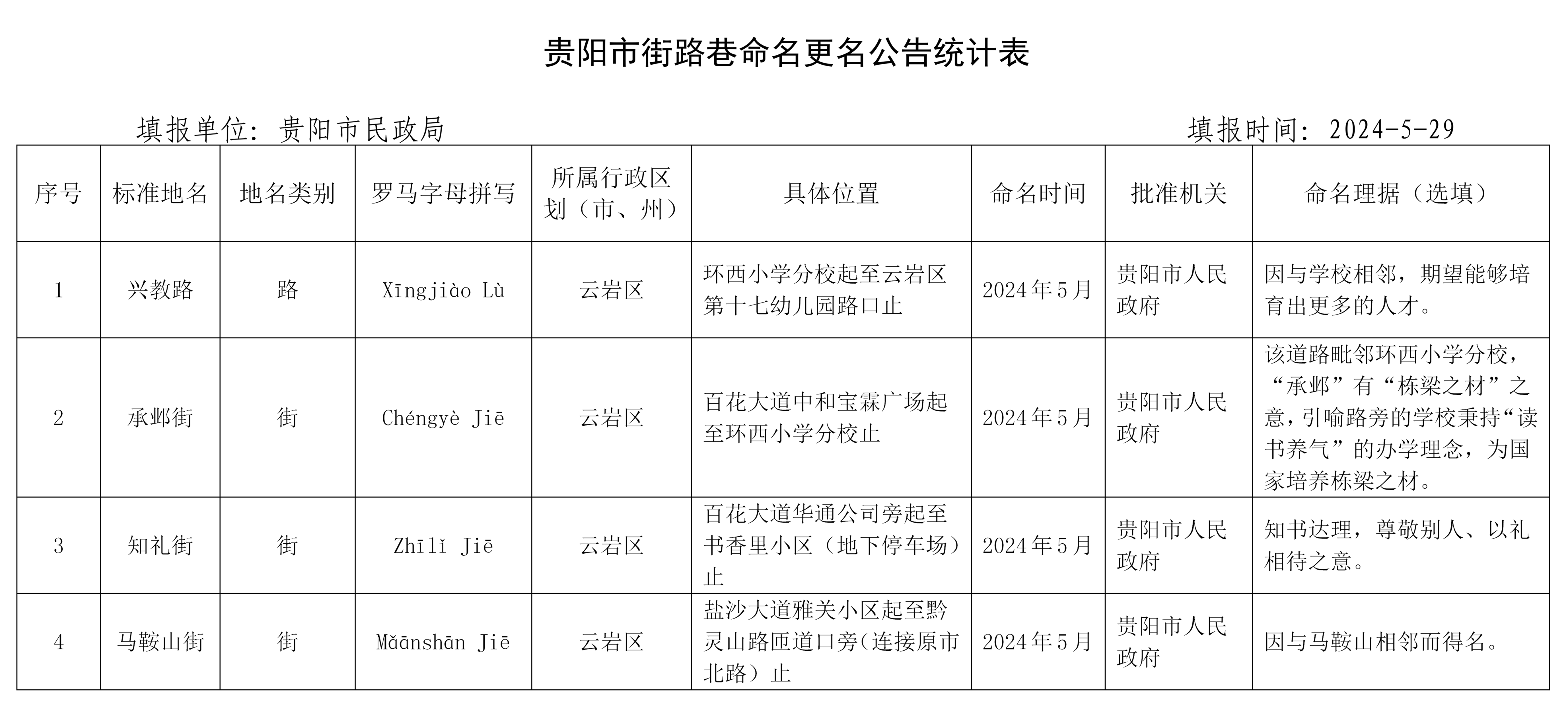 根据国务院《地名管理条例》第十三条、第十四条地名备案和公告的有关规定,贵阳市云岩区兴教路、承邺街、知礼街、马鞍山街4条道路已经由贵阳市人民政府批准命名,现予以公告。