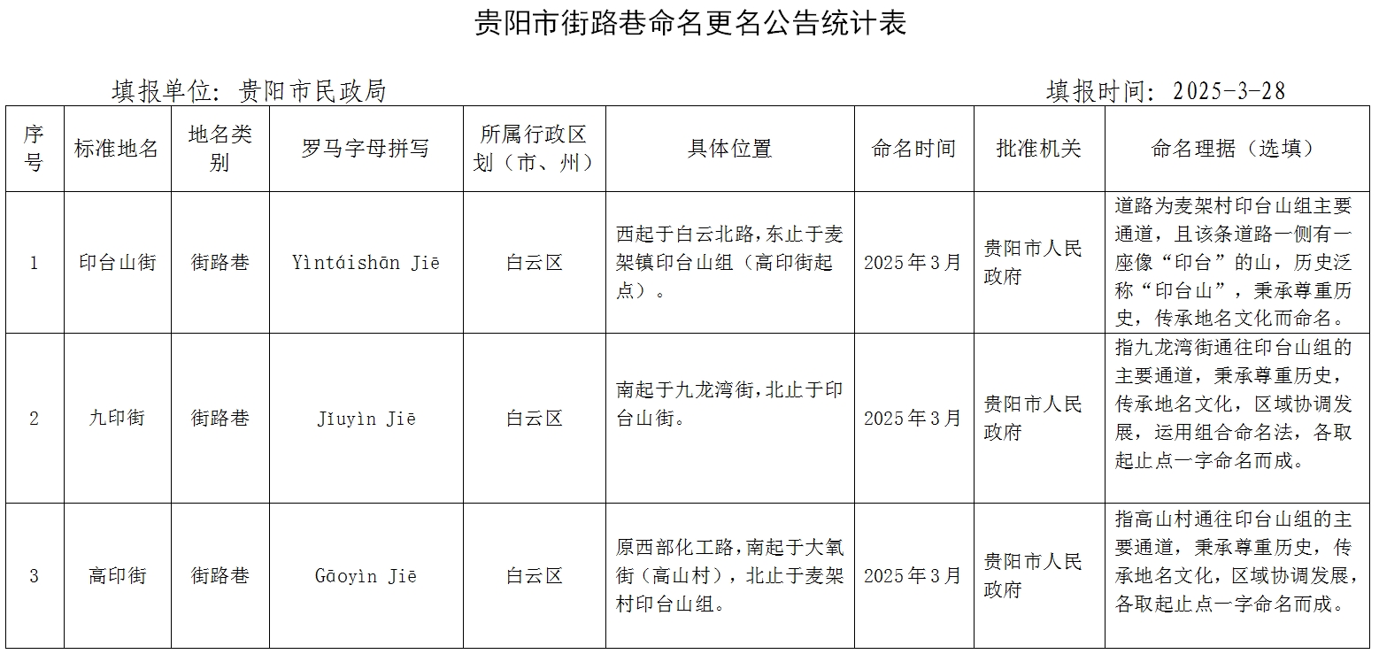 根据国务院《地名管理条例》第十三条、第十四条地名备案和公告的有关规定,贵阳市白云区麦架镇“印台山街”“九印街”“高印街”三条道路已经由贵阳市人民政府批准命名更名,现予以公告。