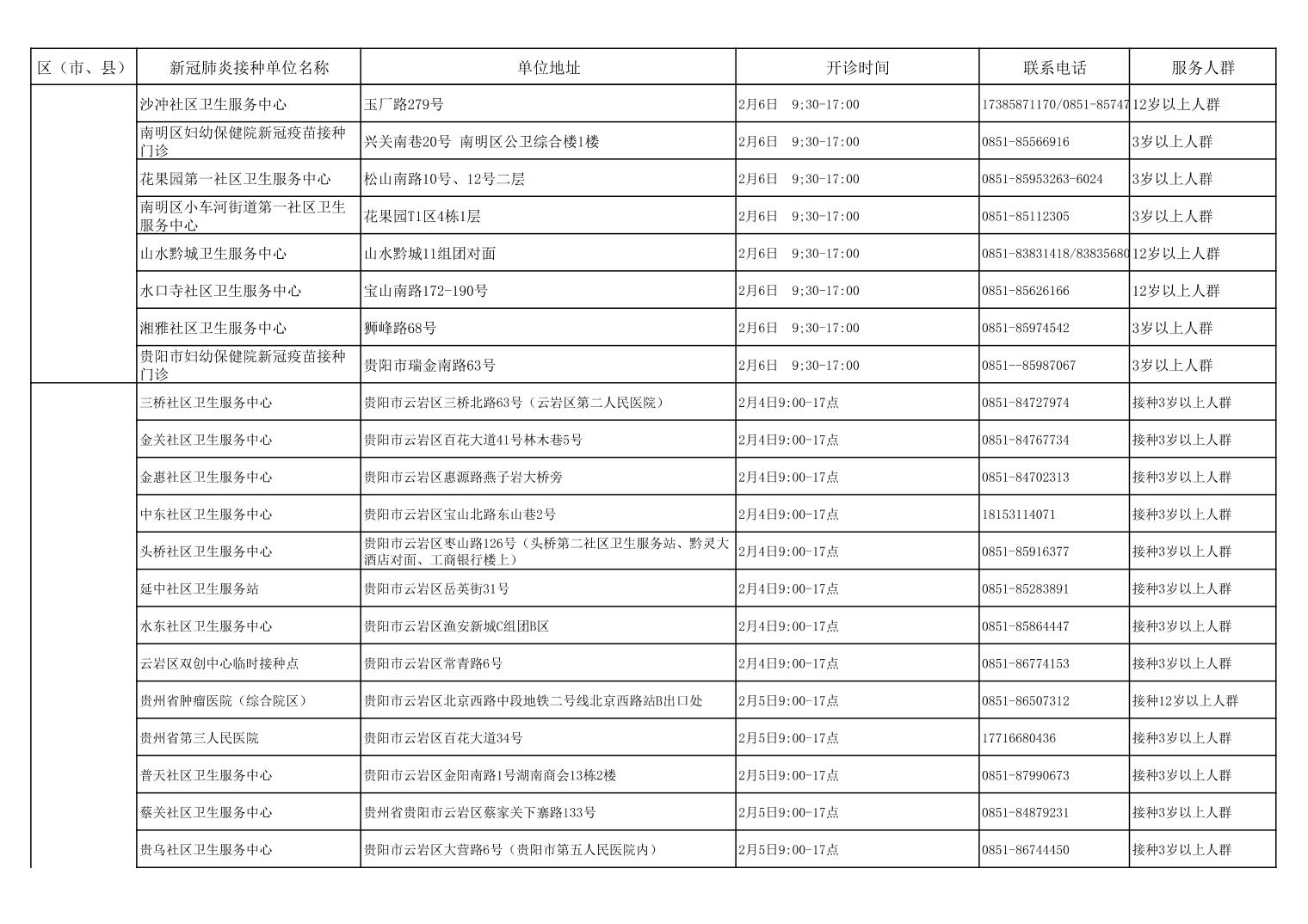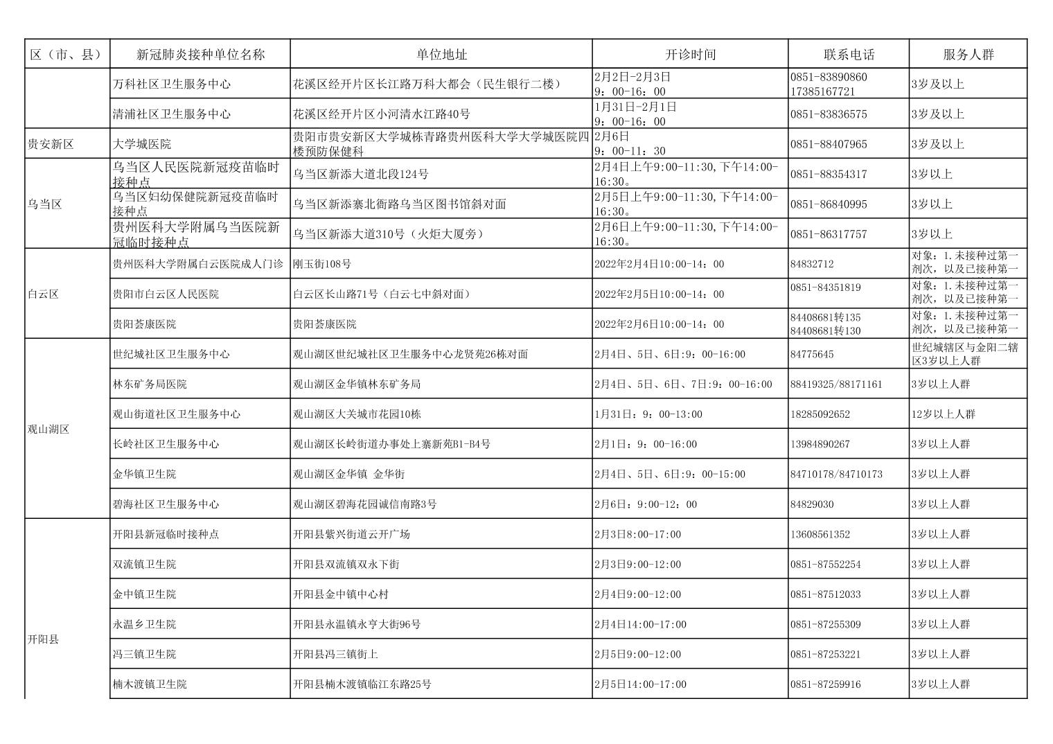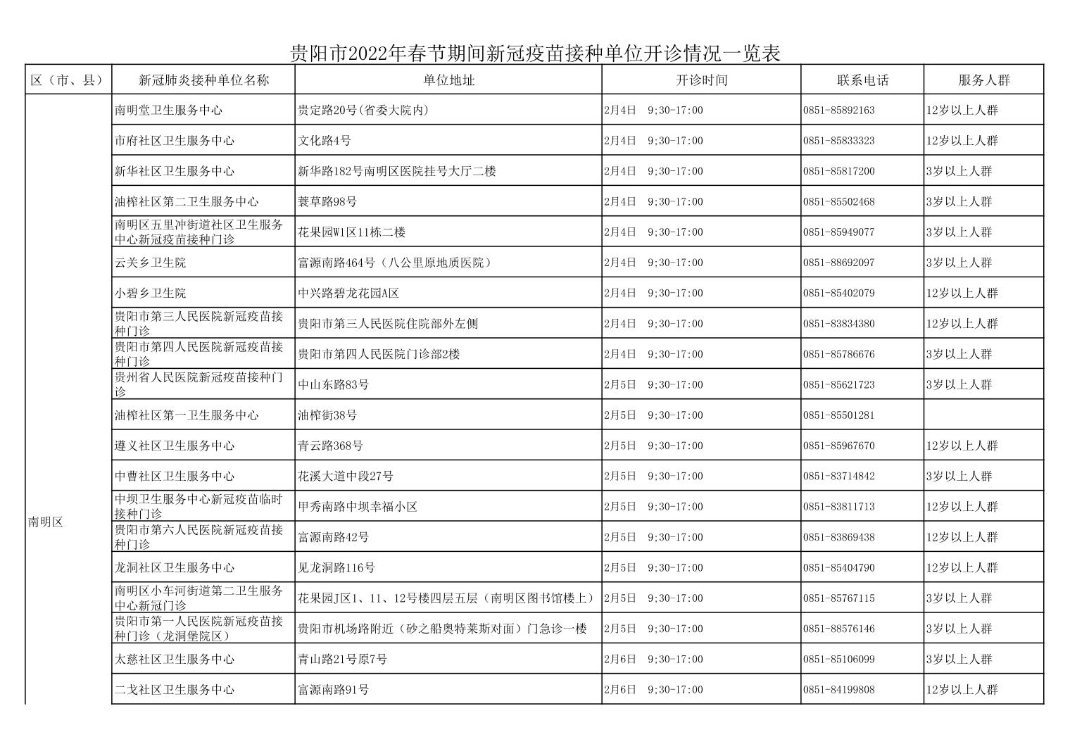 贵阳市2022年春节期间新冠疫苗接种单位开诊情况一览表