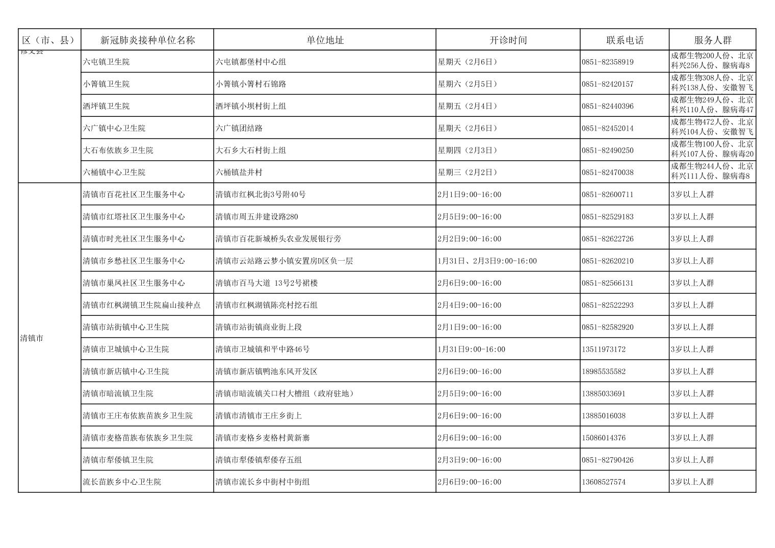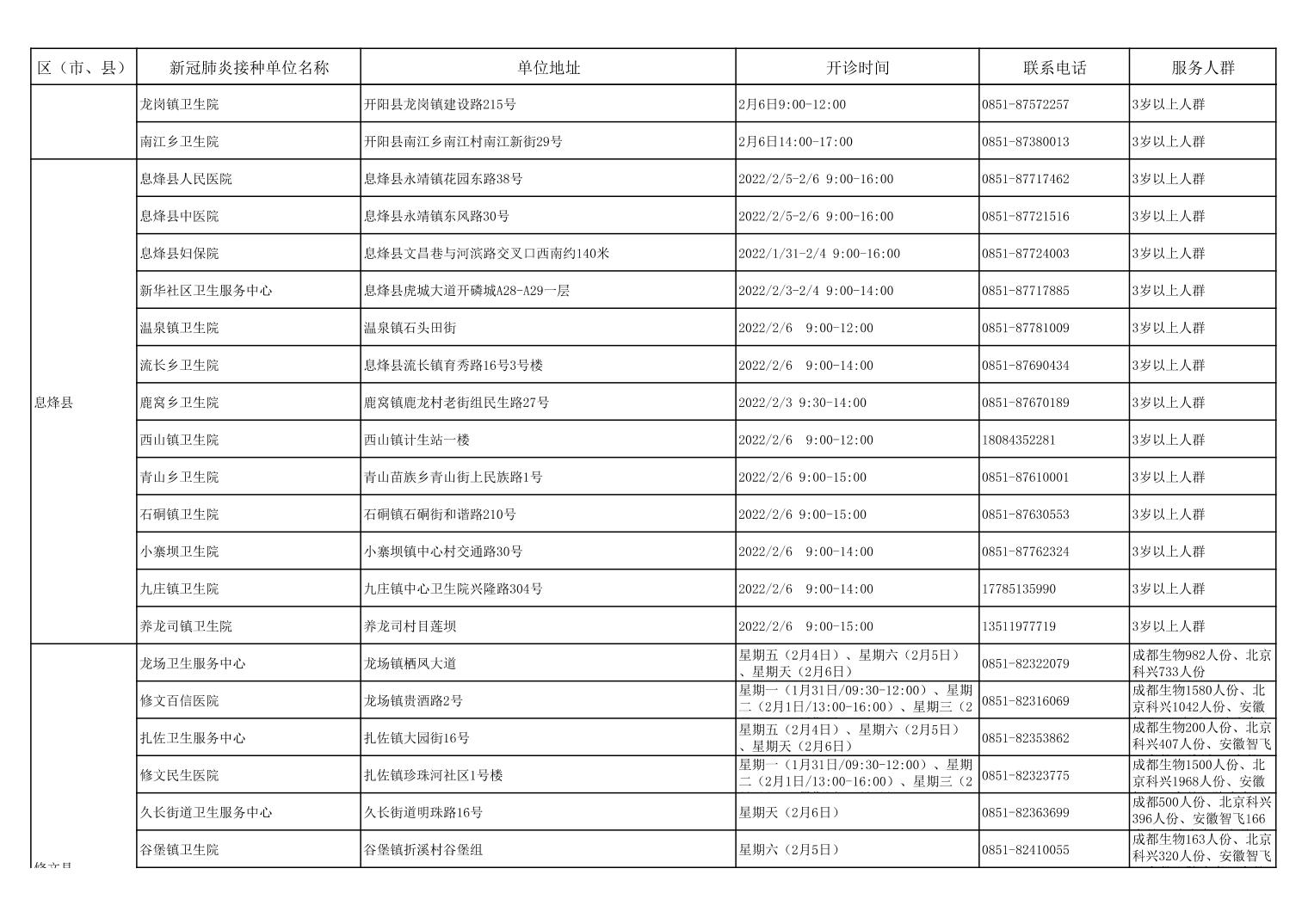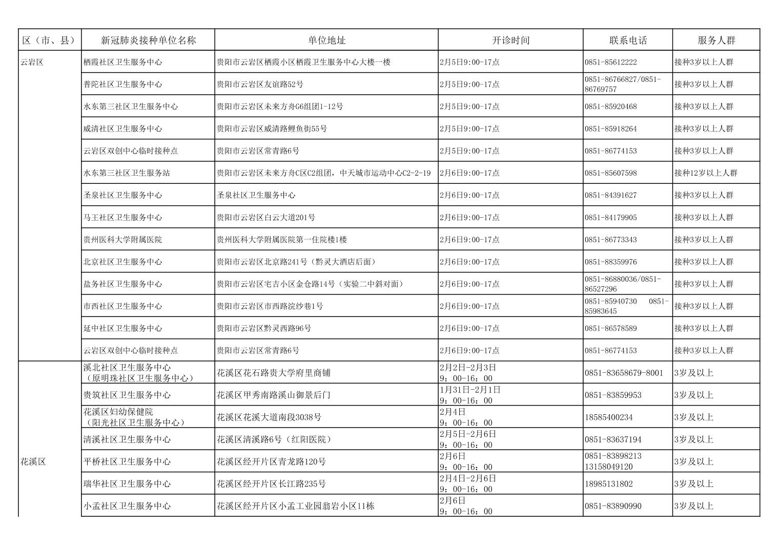 贵阳市2022年春节期间新冠疫苗接种单位开诊情况一览表